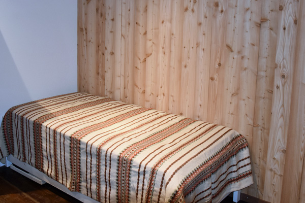 In der Stube steht ein Einzelbett an der Wand. Darunter verstaut befindet sich ein zweites Bett zum Aufstellen. Die schwarzen Bändeli sind zum Zusammenbinden der beiden Betten gedacht, damit diese nicht dauernd auseinanderrutschen.