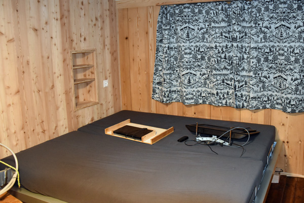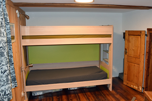 Das obere Kajüttenbett ist recht nahe an der Decke und kann nur von kleinen oder sehr wendigen Personen belegt werden. Zwei zusätzliche Matratzen können am Boden ausgelegt werden (egal in welchem Raum).