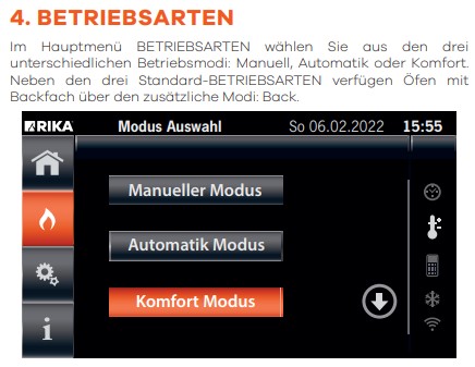 Wir empfehlen hauptsächlich den Komfortmodus! Der Raumsensor befindet sich an der Stubenwand neben dem Buffet. Gewünschte Temperatur einstellen – und der Ofen heizt automatisch. Der Ofen heizt auch während der Nacht, wenn die Temperatur unter den gewünschten Wert sinkt.